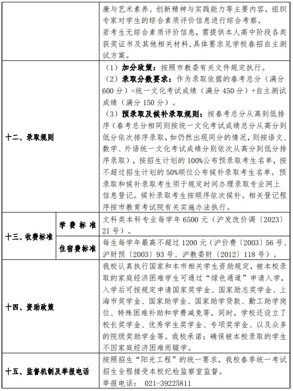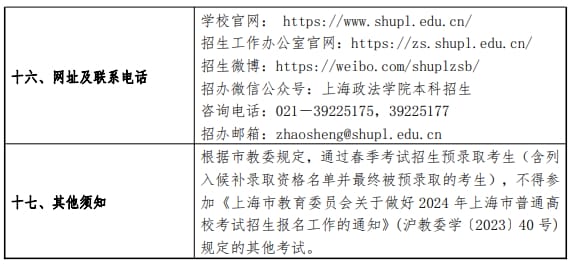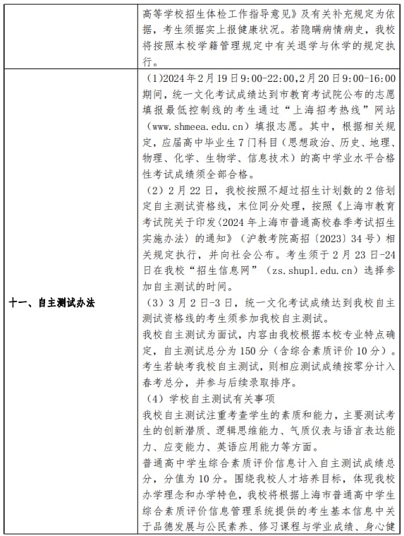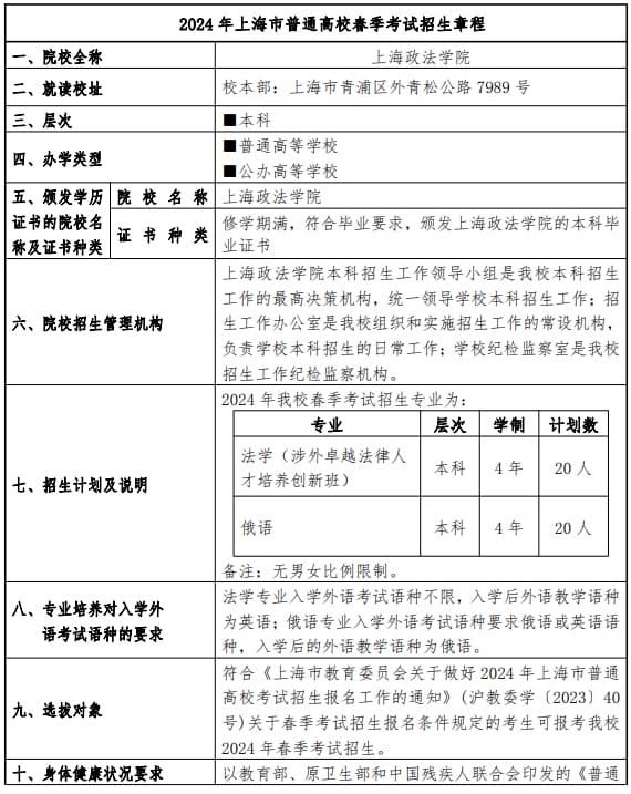 上海政法学院2024年春季高考招生章程